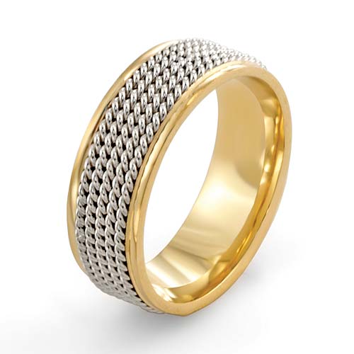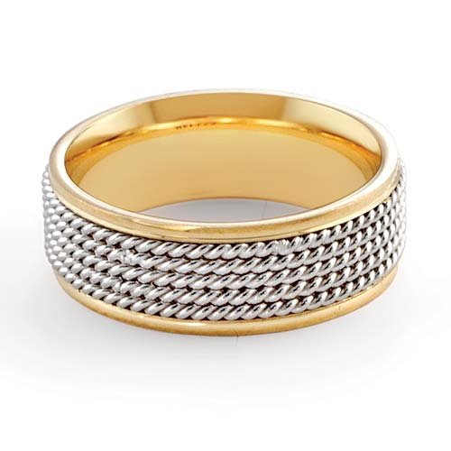 14 karat yellow and white GOLD 7.7mm wedding band with white GOLD, 5 row rope design and comfort fit.