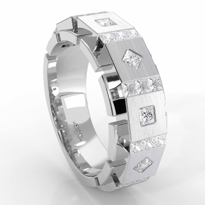 Square & kite shape set diamond matte men's half wedding band is made from 18k Gold White. This comfort fit ring features box style block design with princess cut diamond set in a bezel & channel setting.