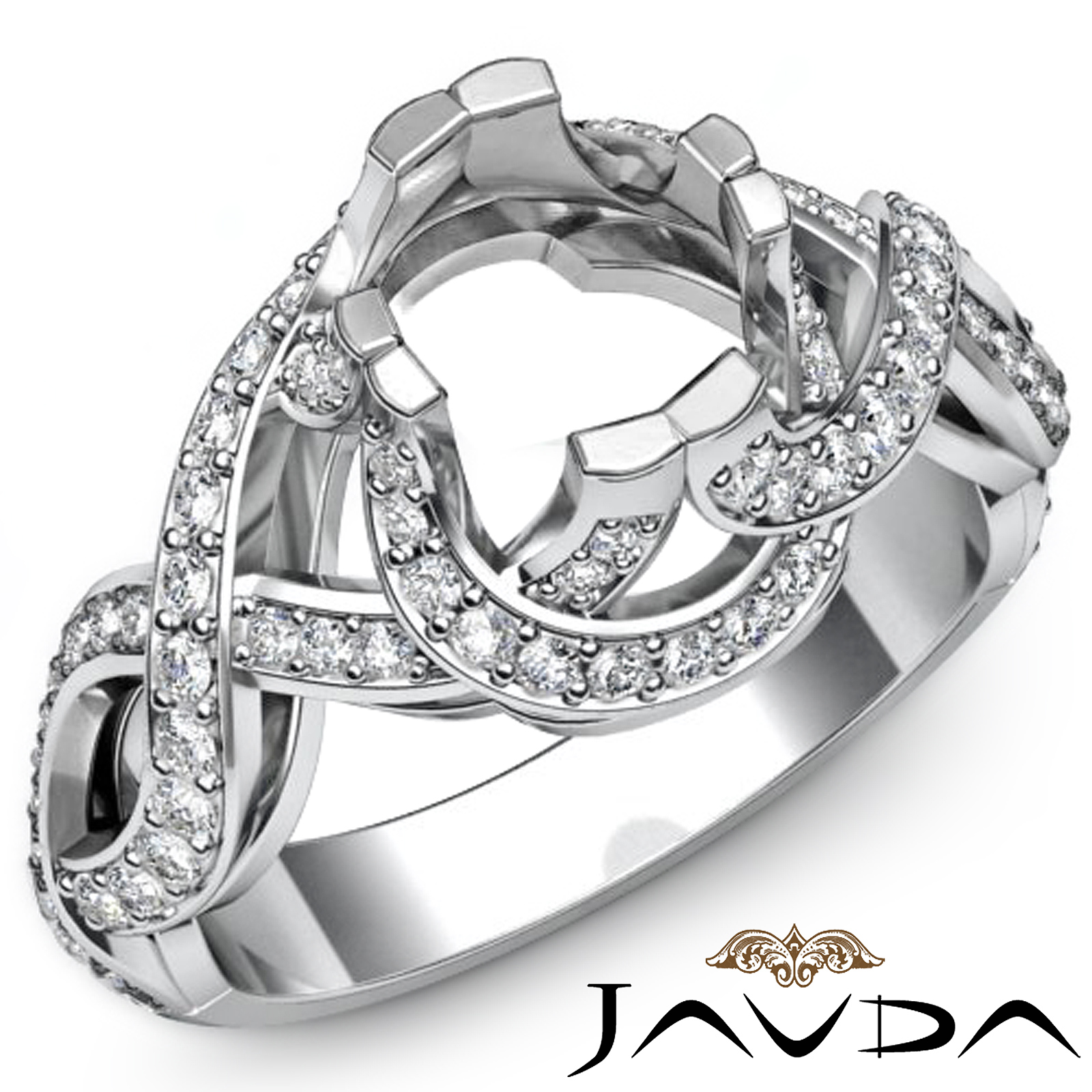 This strikingly sophisticated Platinum 950 engagement ring showcases your round semi mount and the magical shank in of pave set round diamonds. (1Ct. tw.)