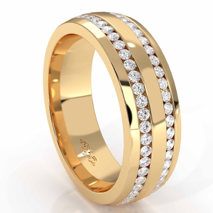 Classic and stylish dome 2 row round diamond eternity men's wedding band is made from 14k Gold Yellow. Showcasing this ring polished finished dome with two row total round diamonds in a channel setting.