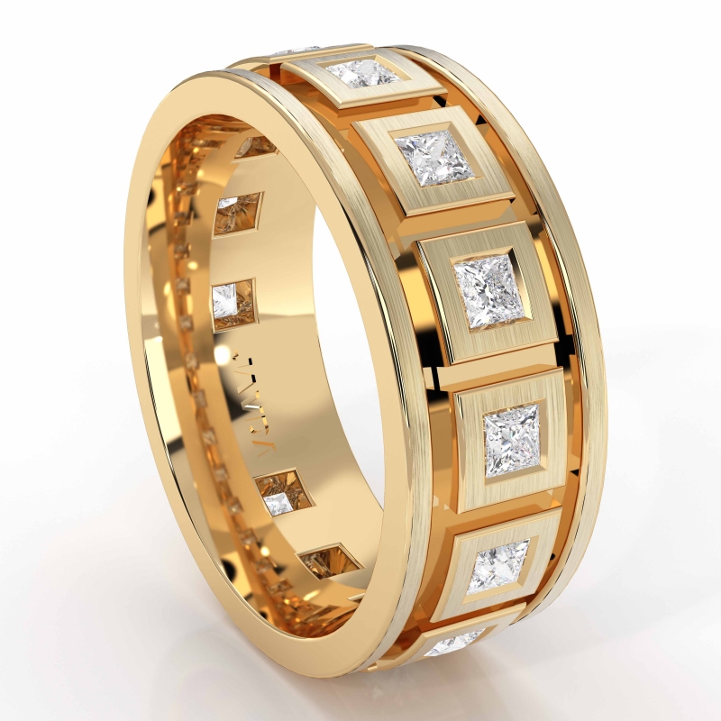 This men's matte finish diamond eternity wedding band has been crafted in 14k Gold Yellow. Featuring matte finished flat edge and bezel princess diamond beautifully set in a box style.