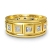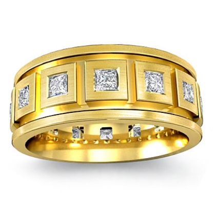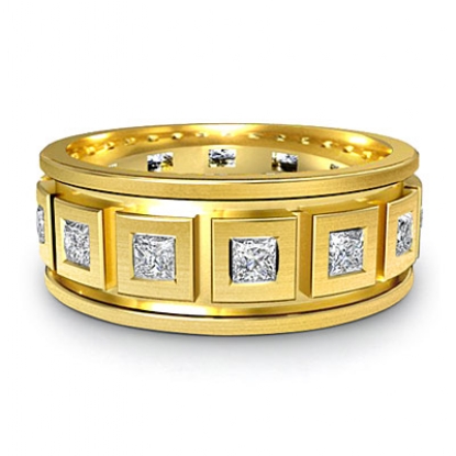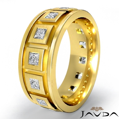 This men's matte finish diamond eternity wedding band has been crafted in 18k Gold Yellow. Featuring matte finished flat edge and bezel princess diamond beautifully set in a box style.