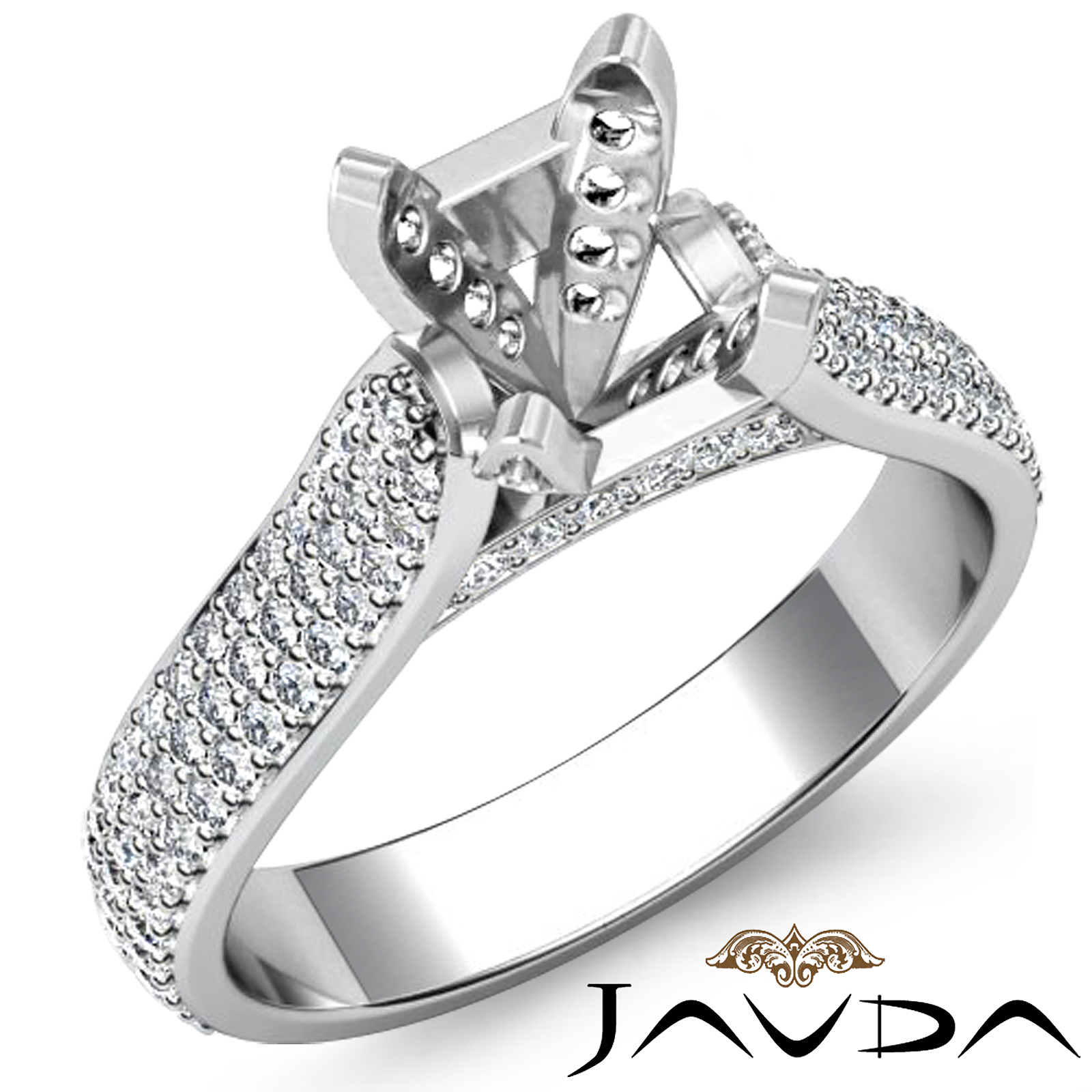 Eyes will be fixated on this one! This round semi mount diamond engagement ring is made in 18k Gold White. It displays pave set round diamonds in halo & along the shank. (1.45Ct. tw.)
