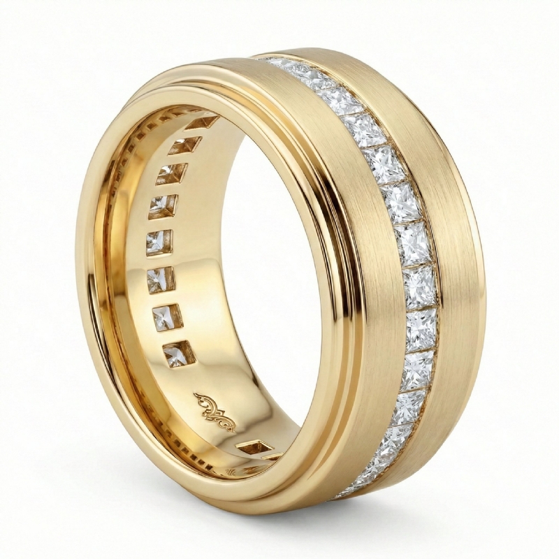 An elegant and stylish princess diamond eternity men's wedding band is made from 14k Gold Yellow. Featuring polished finish step edge and princess diamonds set in a channel setting.