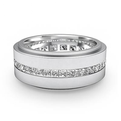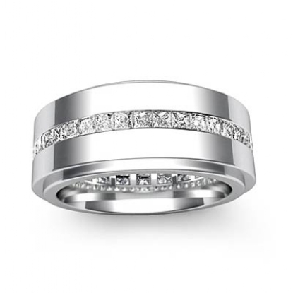 An elegant and stylish princess diamond eternity men's wedding band is made from Platinum 950. Featuring polished finish step edge and princess diamonds set in a channel setting.