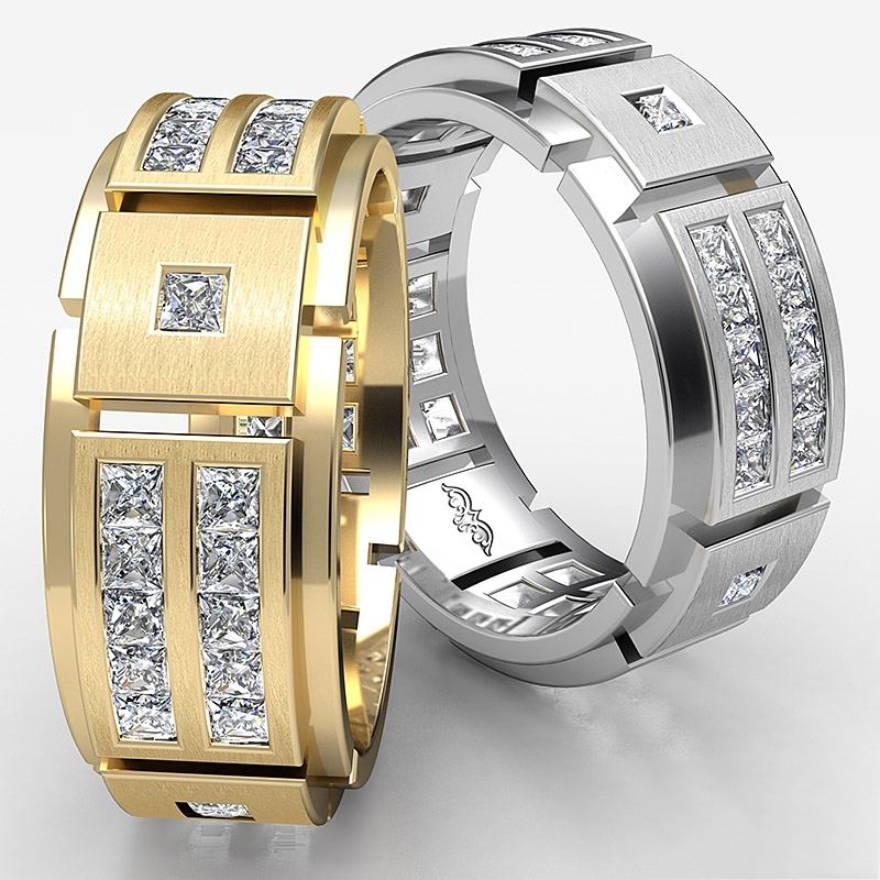A stunning 2 row men's princess diamond eternity wedding band is crafted in quality 14k Gold Yellow. Featuring this ring polished finished with vertical grooved and princess diamonds in a channel setting.