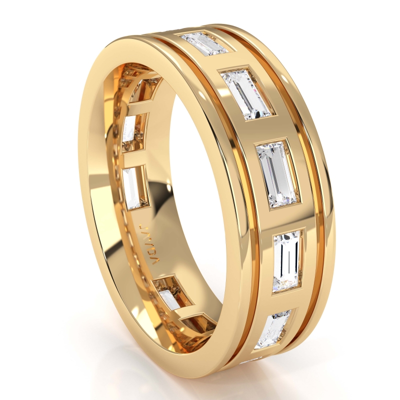 The classy look bezel set baguette men's diamond eternity wedding band is made from quality 14k Gold Yellow. Featuring polished finish parallel grooved with baguette in a bezel setting.