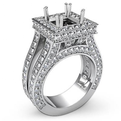 Lavishly romantic, this diamond engagement ring is made in glorious 14K white gold. This princess semi mount ring features 2.5ct. pave set round diamonds in halo & shank.