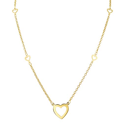 a 1" open heart hangs at the end of a simple heart link, rolo link, 14 karat yellow gold necklace