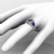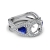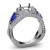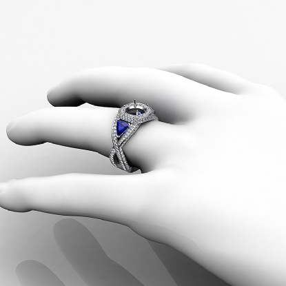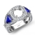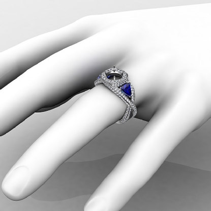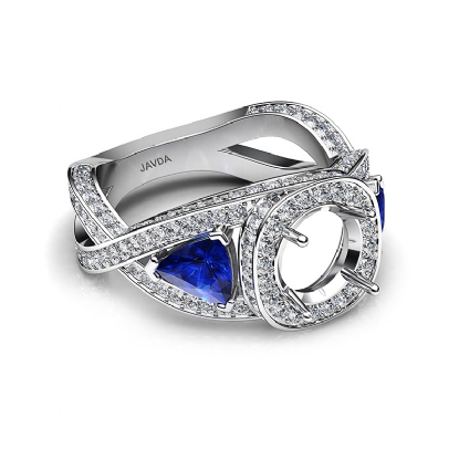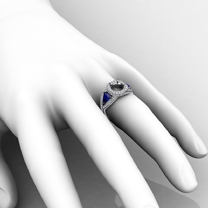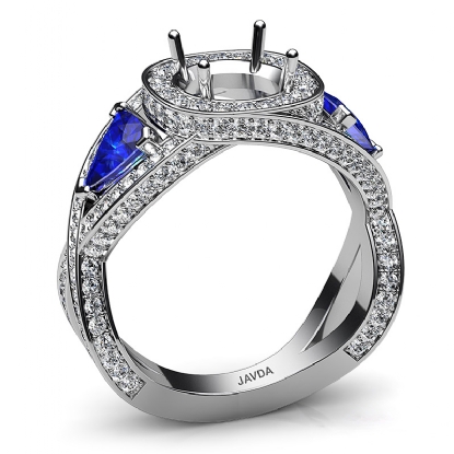 This beautiful three stone engagement ring made in 14K white gold. 1.3ct. of round diamonds frame the semi mount round diamond halo & the shank, surrounding the 0.71ct. side sapphire trillion diamonds.