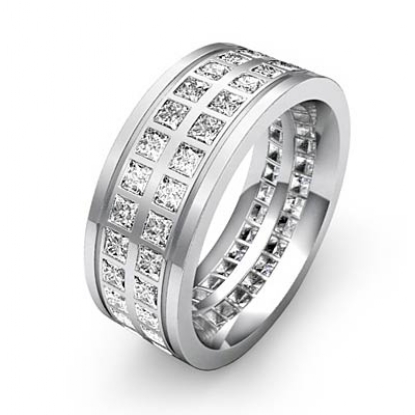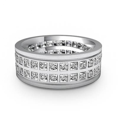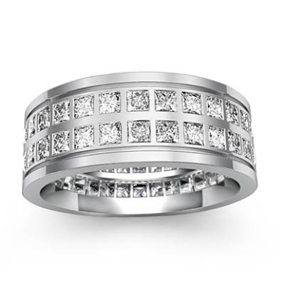 Elegant double row princess diamond men's eternity wedding band is made from solid 18k Gold White. This handsome wedding ring features polished flat edge with princess diamonds in a bezel setting.