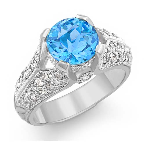 2.80 CT Blue Topaz Gemstone & 0.80 Carat Round Diamond Women Ring made in 14K White Gold.