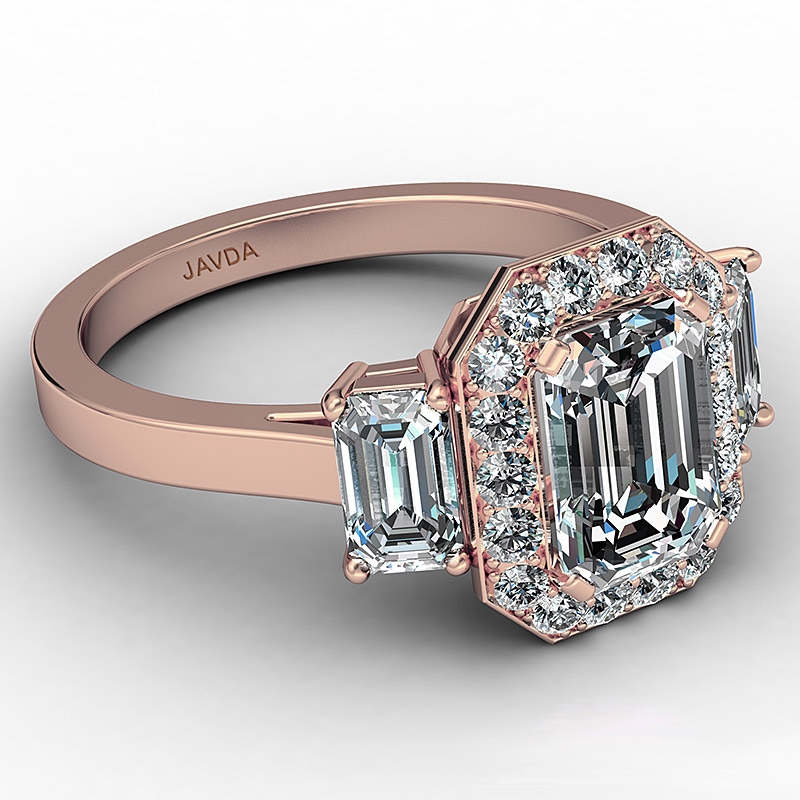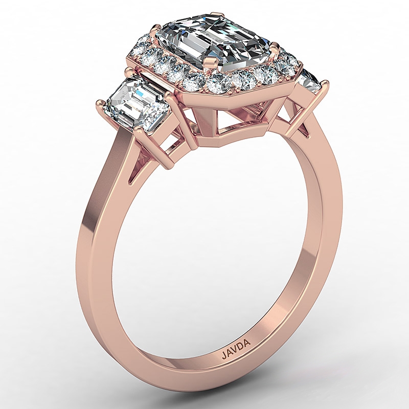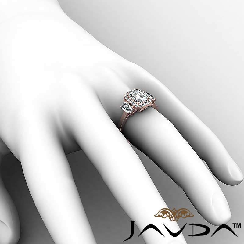 3 Stone Halo Diamond Engagement Emerald Semi Mount 14k Rose Gold Ring 0.78Ct.