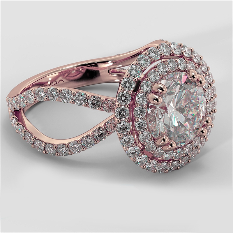 2 Row Halo Diamond Engagement Ring 14k Rose Gold Round Semi Mount Band 0.9Ct.