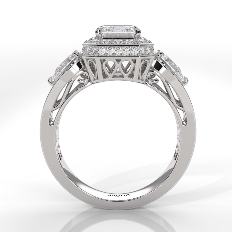 Emerald Diamond Engagement Halo 3Stone Ring Set Platinum 950 Semi Mount 1.85Ct.