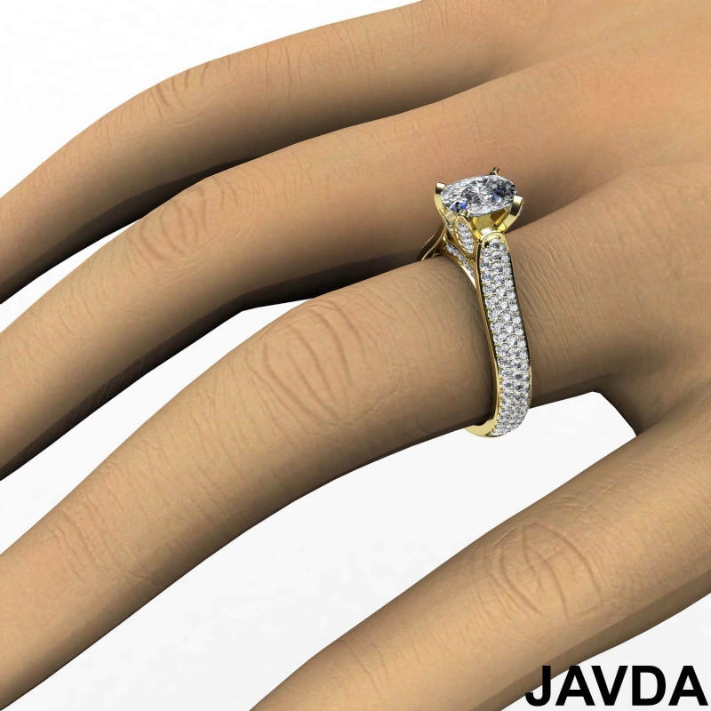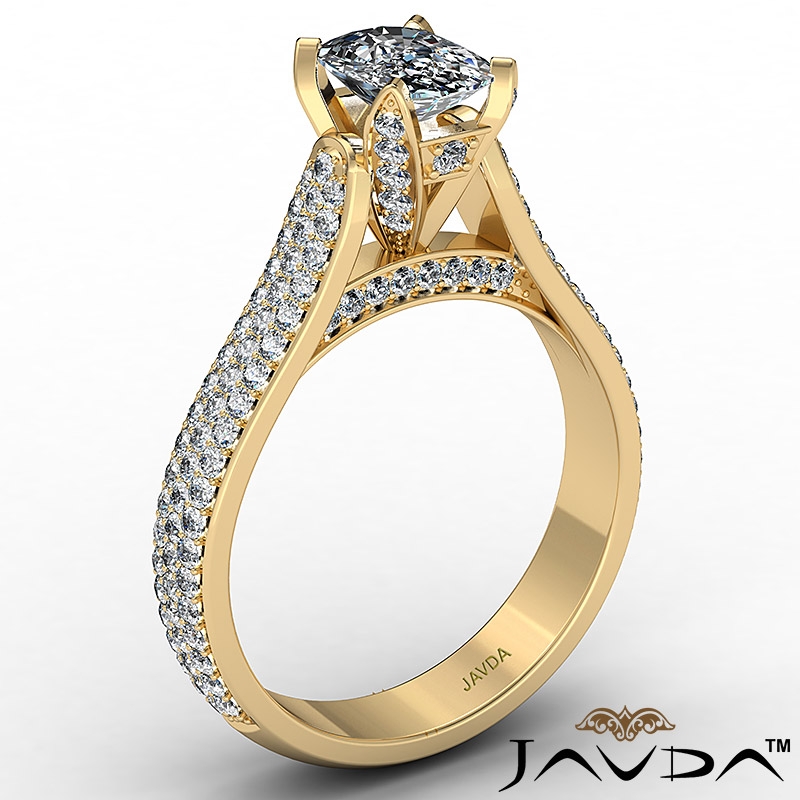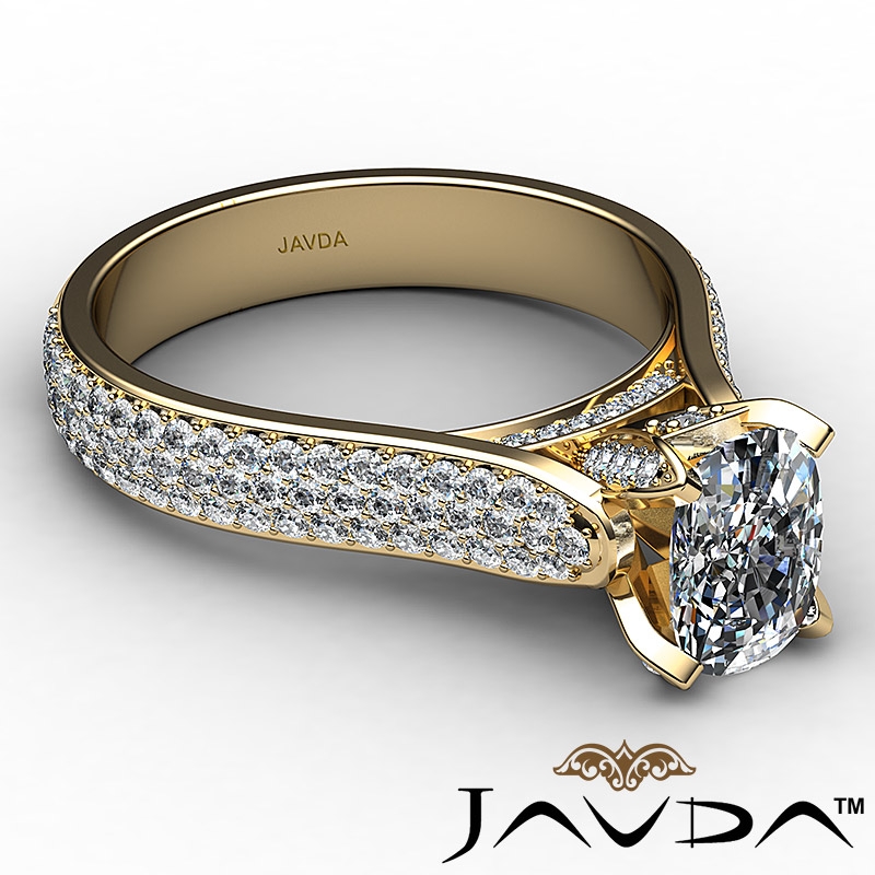 Micro Pave Set 3 Row Shank style Engagement Ring, center is Cushion shape Diamond Report by GIA, F Color & VVS2 clarity, Made in 14k Yellow Gold (1.96 ct. tw.)