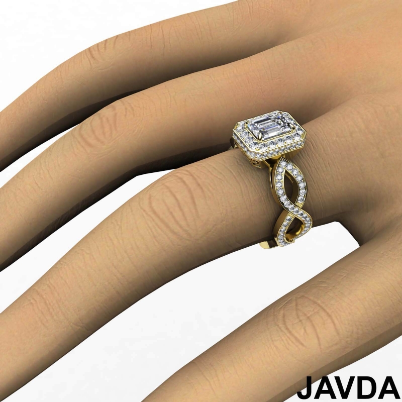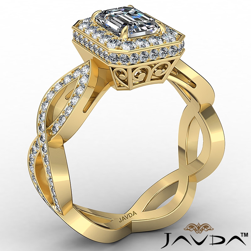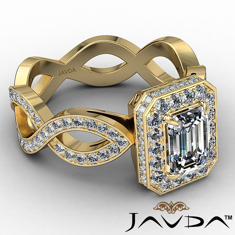 Infinity Shank Halo Micro Pave style Engagement Ring, center is Emerald shape Diamond Report by GIA, I Color & VVS2 clarity, Made in 18k Yellow Gold (2.13 ct. tw.)
