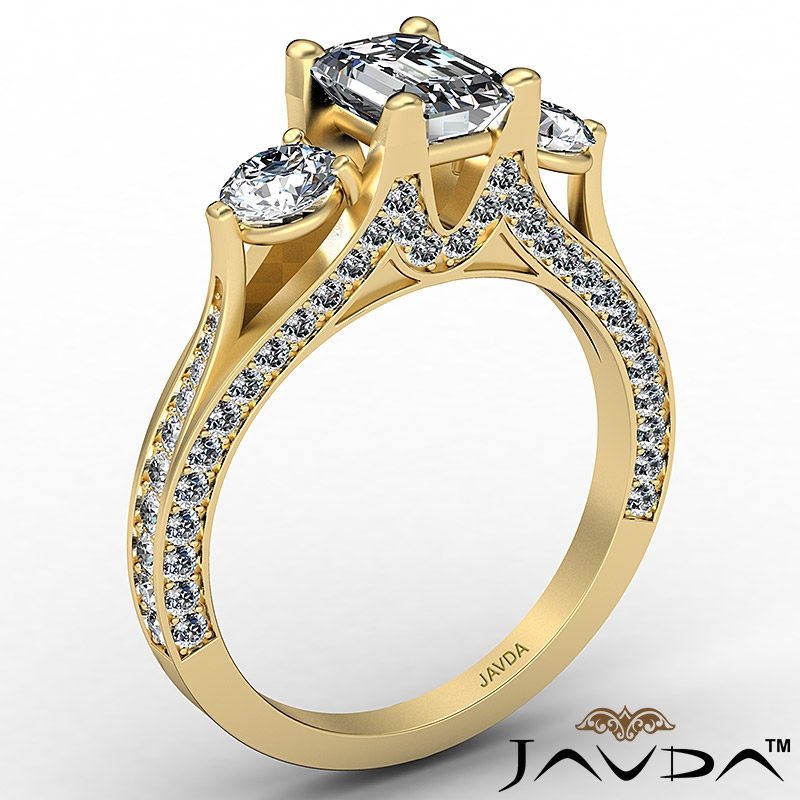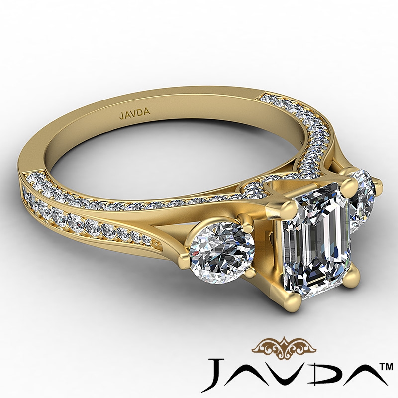 Trellis Style Three Stone style Engagement Ring, center is Emerald shape Diamond Report by GIA, D Color & VVS1 clarity, Made in 18k Yellow Gold (2 ct. tw.)
