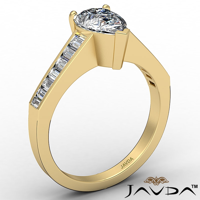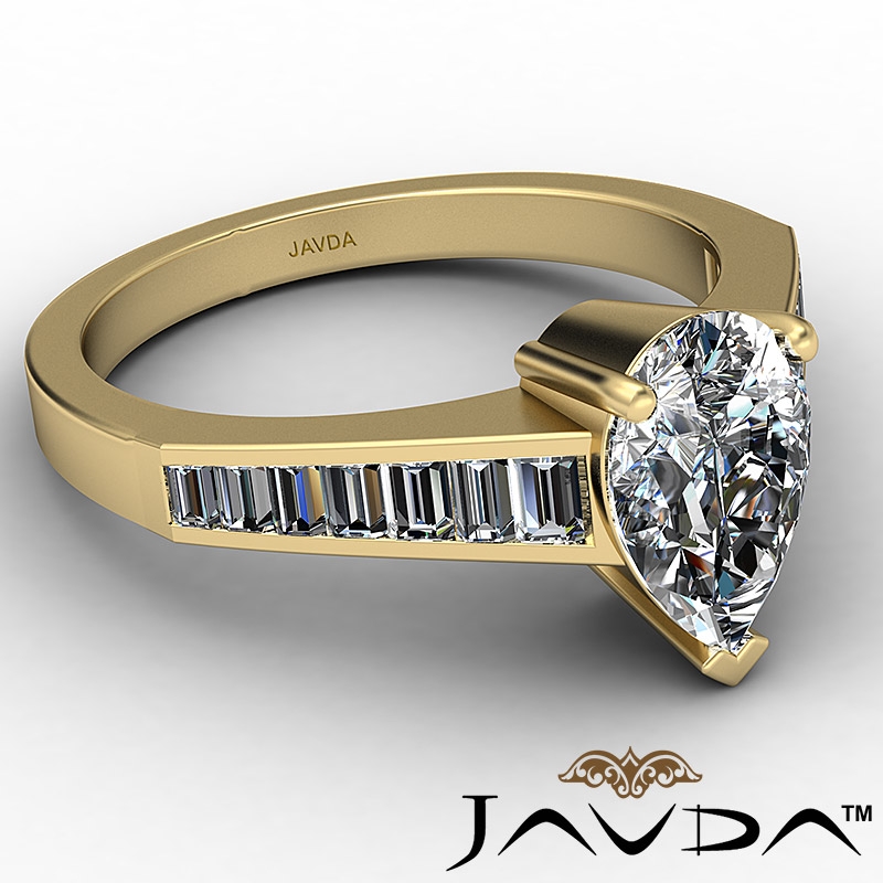 Channel Set Tapered Baguette style Engagement Ring, center is Pear shape Diamond Report by GIA, D Color & VS1 clarity, Made in 14k Yellow Gold (1.35 ct. tw.)