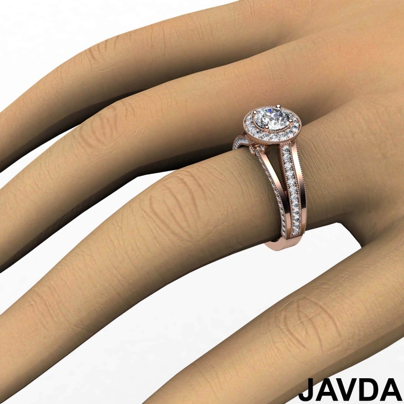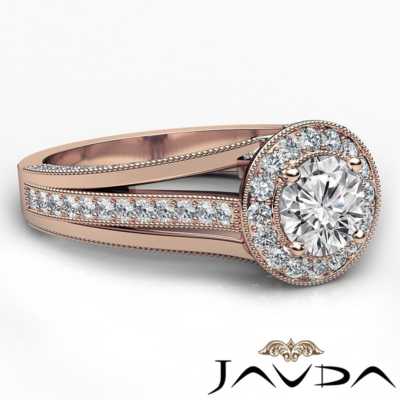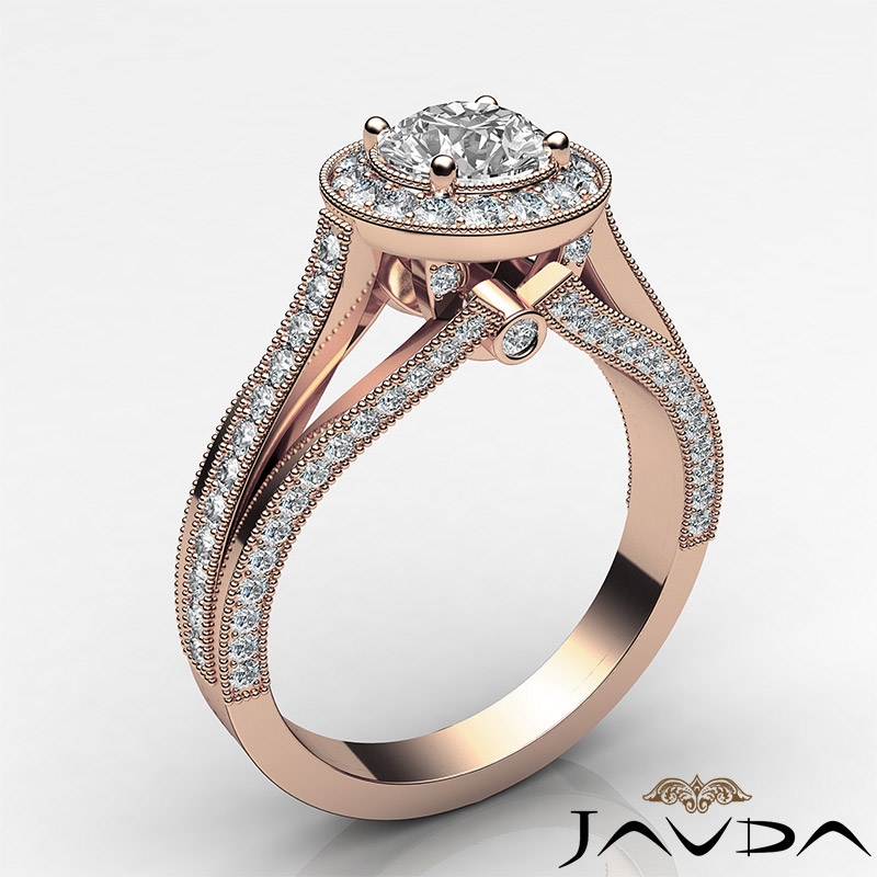 Halo Pave Diamond Engagement Round Semi Mount Millgrain Ring 14k Rose Gold 0.9Ct.