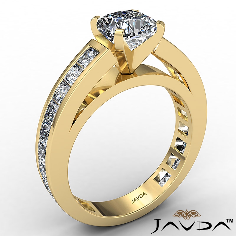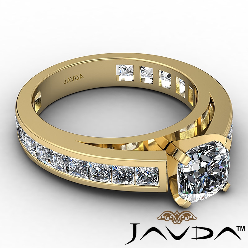 Classic V Prong Channel Set style Engagement Ring, center is Cushion shape Diamond Report by GIA, E Color & VVS2 clarity, Made in 18k Yellow Gold (2.2 ct. tw.)