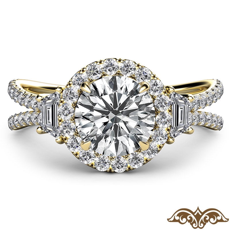 Baguette Three Stone Halo Pave style Engagement Ring, center is Round shape Diamond Report by GIA, H Color & SI1 clarity, Made in 14k Yellow Gold (1.85 ct. tw.)