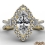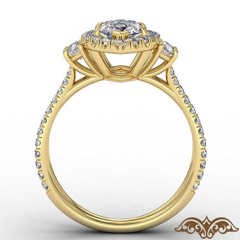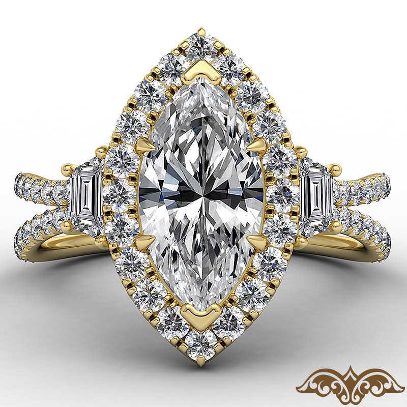 Baguette Three Stone Halo Pave style Engagement Ring, center is Marquise shape Diamond Report by GIA, F Color & VVS2 clarity, Made in 14k Yellow Gold (2.05 ct. tw.)