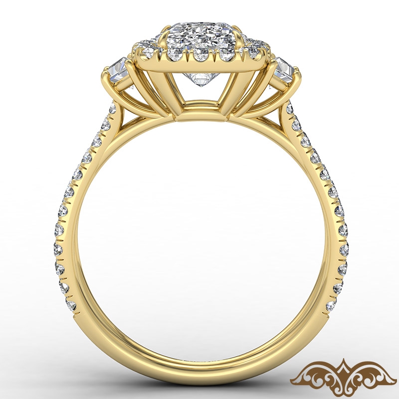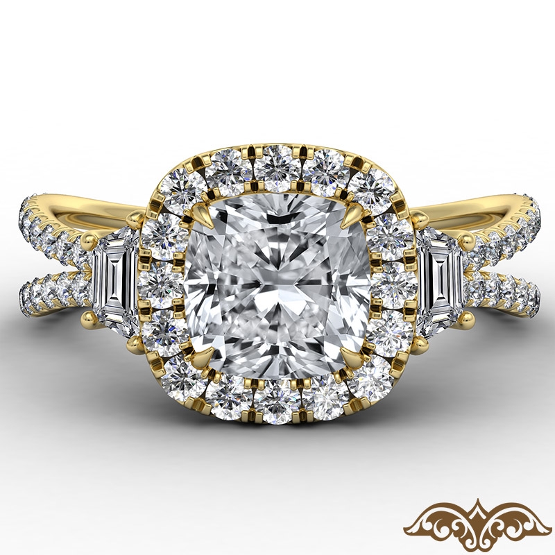 Baguette Three Stone Halo Pave style Engagement Ring, center is Cushion shape Diamond Report by IGI, D Color & VS1 clarity, Made in 18k Yellow Gold (2.06 ct. tw.)