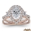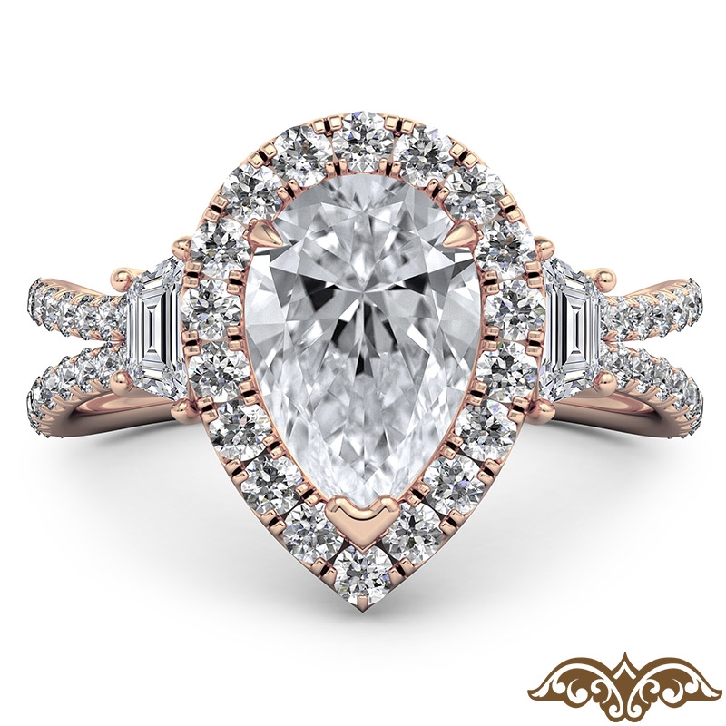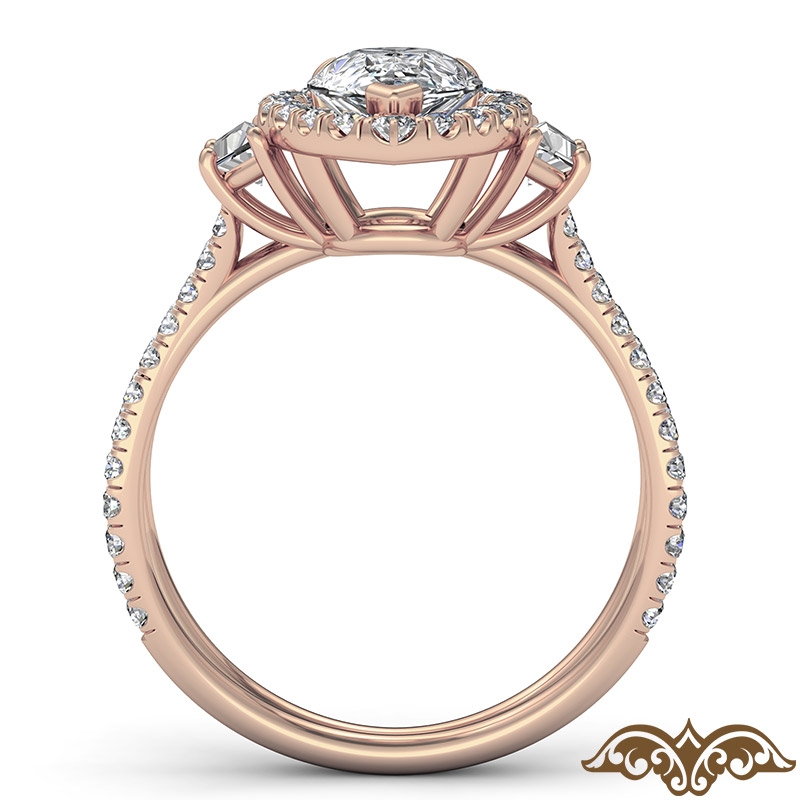 Baguette Three Stone Halo Pave style Engagement Ring, center is Pear shape Diamond Report by IGI, E Color & VS1 clarity, Made in 14k Rose Gold (2.27 ct. tw.)