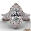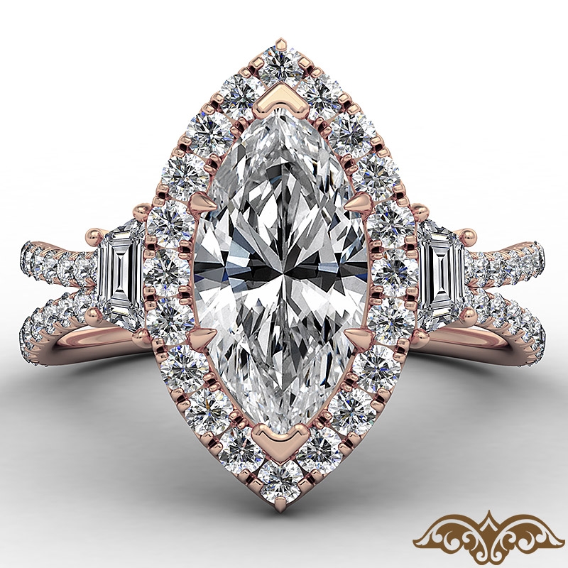 Baguette Three Stone Halo Pave style Engagement Ring, center is Marquise shape Diamond Report by IGI, E Color & VS1 clarity, Made in 14k Rose Gold (2.47 ct. tw.)