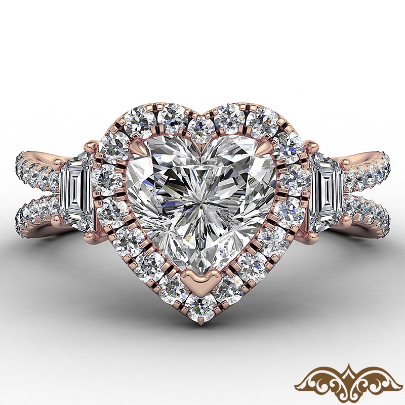 Baguette Three Stone Halo Pave style Engagement Ring, center is Heart shape Diamond Report by GIA, J Color & SI2 clarity, Made in 18k Rose Gold (1.89 ct. tw.)