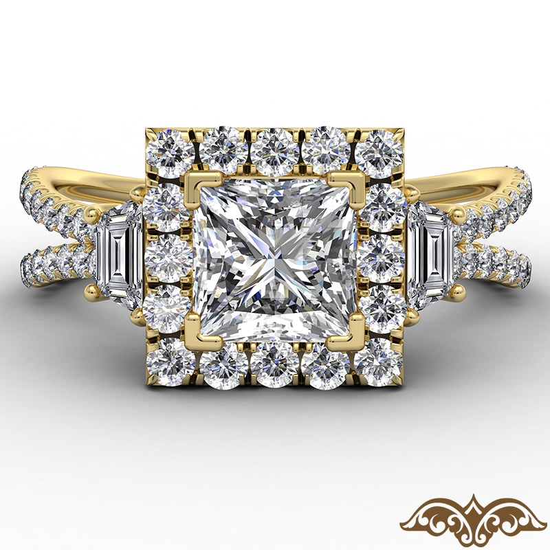 Split Shank Halo Three Stone style Engagement Ring, center is Princess shape Diamond Report by GIA, H Color & VVS2 clarity, Made in 18k Yellow Gold (1.9 ct. tw.)