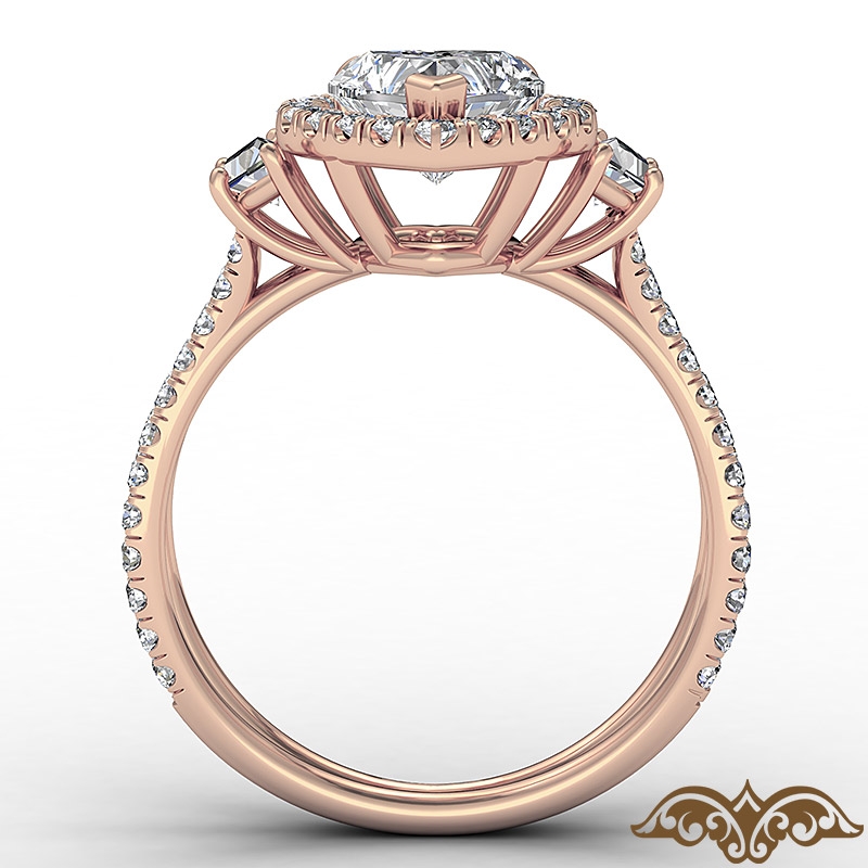 Halo Three Stone French U Pave style Engagement Ring, center is Heart shape Diamond Report by GIA, G Color & IF clarity, Made in 14k Rose Gold (1.82 ct. tw.)