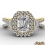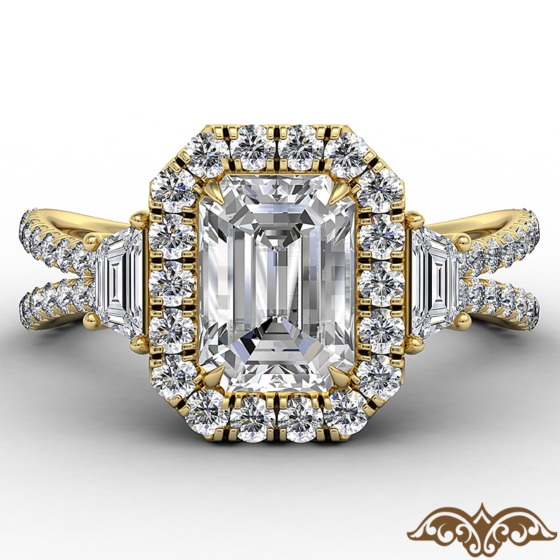 Three Stone Halo Diamond Emerald Cut Semi Mount Engagement Ring 18k Yellow Gold 1.1Ct.