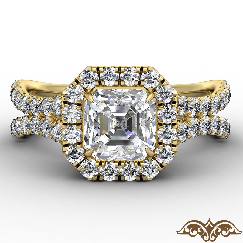 Cathedral Halo French Pave style Engagement Ring, center is Asscher shape Diamond Report by IGI, D Color & VS1 clarity, Made in 14k Yellow Gold (2.18 ct. tw.)