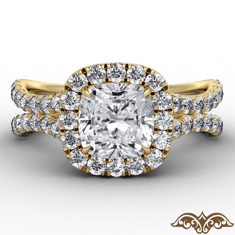 Cathedral Halo French Pave style Engagement Ring, center is Cushion shape Diamond Report by IGI, D Color & VS1 clarity, Made in 18k Yellow Gold (2.11 ct. tw.)