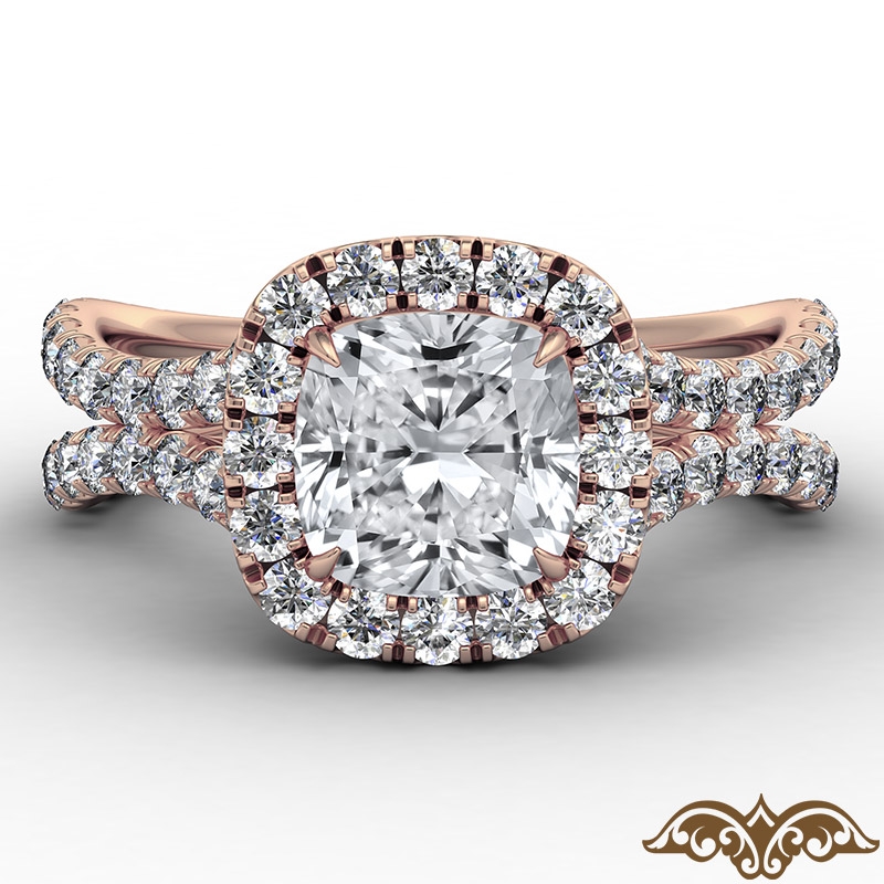 Cathedral Halo French Pave style Engagement Ring, center is Cushion shape Diamond Report by IGI, D Color & VS1 clarity, Made in 14k Rose Gold (2.11 ct. tw.)