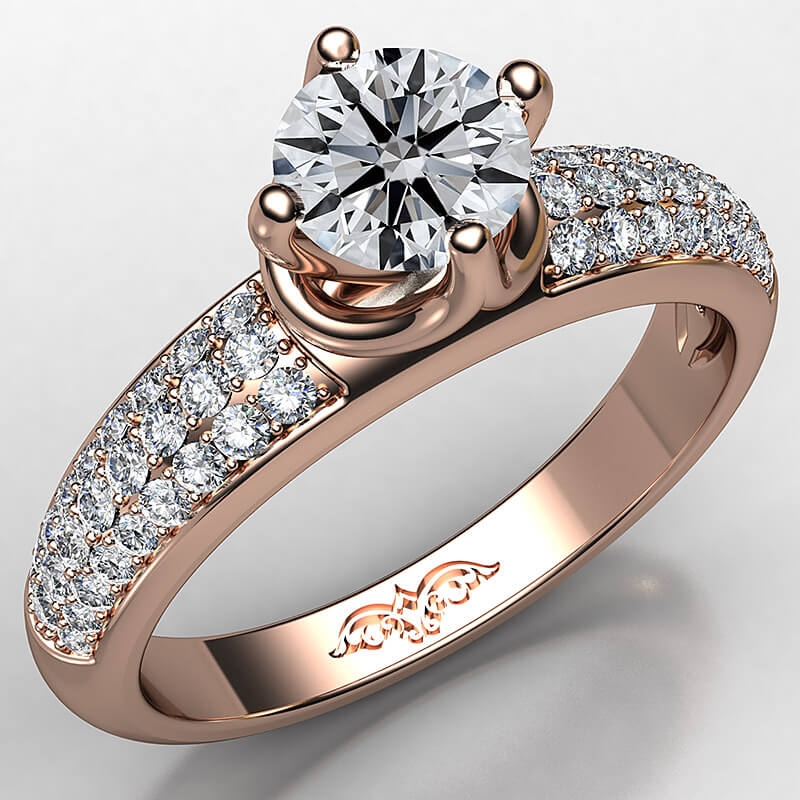 Three Row Micropave Set Shank style Engagement Ring, center is Round shape Diamond Report by IGI, D Color & VS1 clarity, Made in 14k Rose Gold (1.34 ct. tw.)