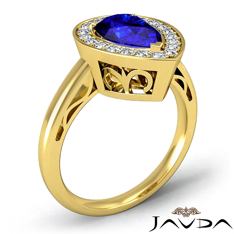 Halo Sidestone Filigree style Engagement Ring, center is Pear shape D Block Tanzanite Report by , Color & clarity, Made in 18k Yellow Gold (1.36 ct. tw.)