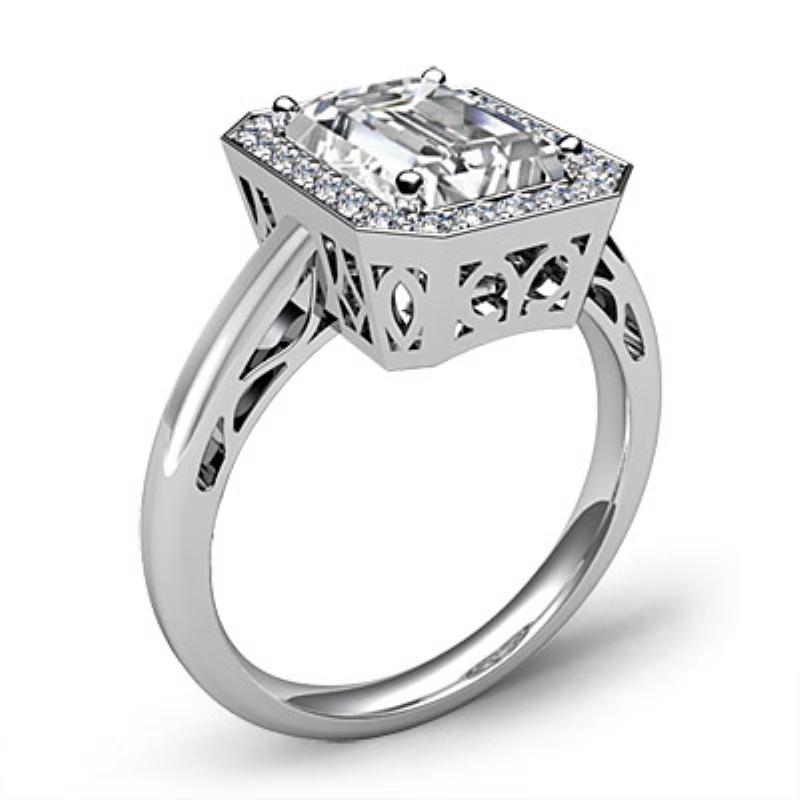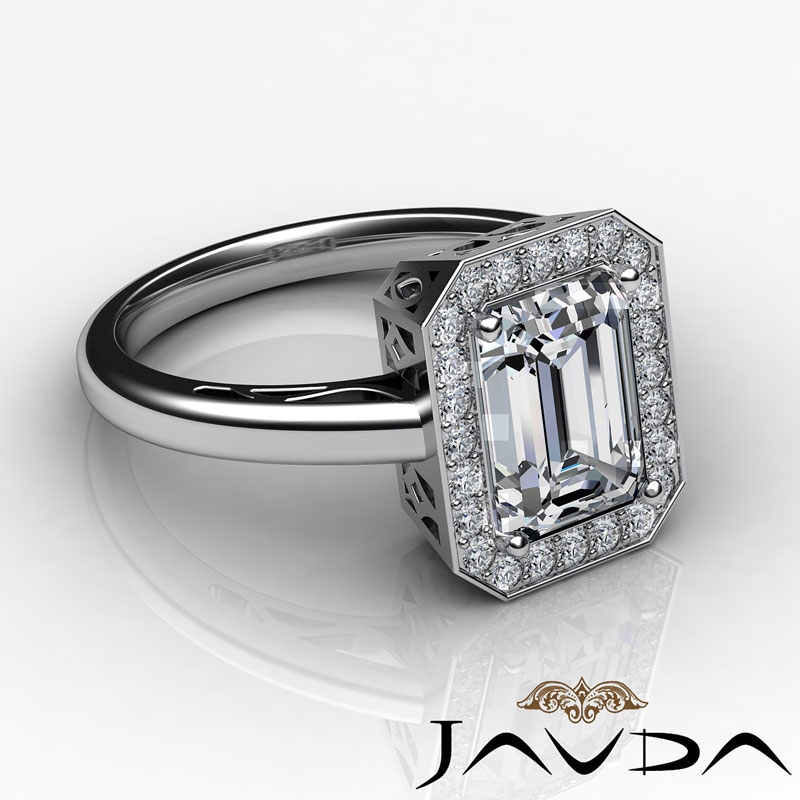 Halo Sidestone Filigree style Engagement Ring, center is Emerald shape Diamond Report by GIA, D Color & VVS1 clarity, Made in Platinum 950 (1.16 ct. tw.)
