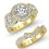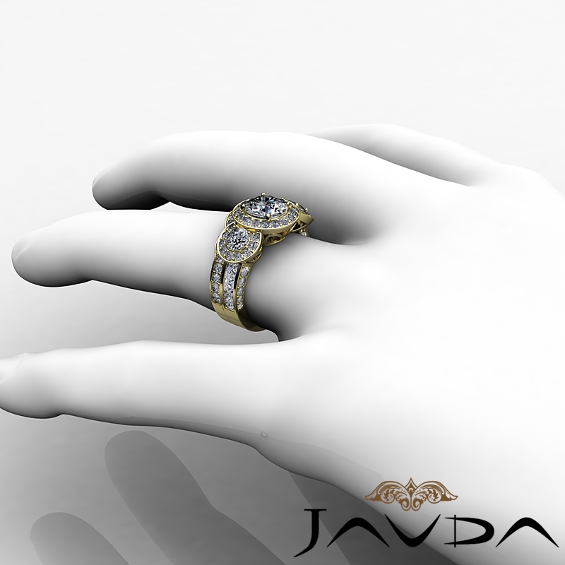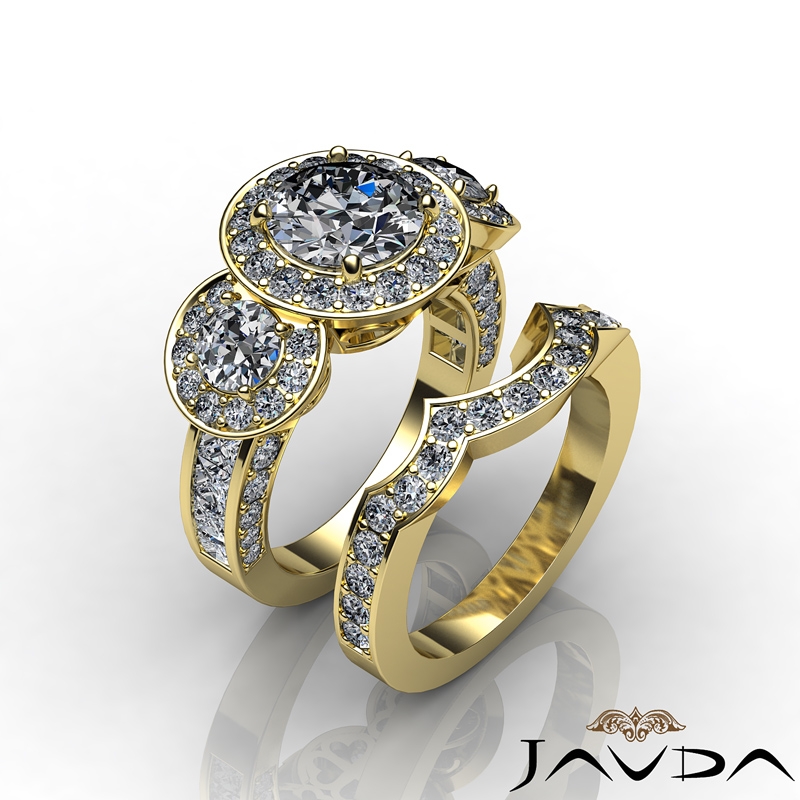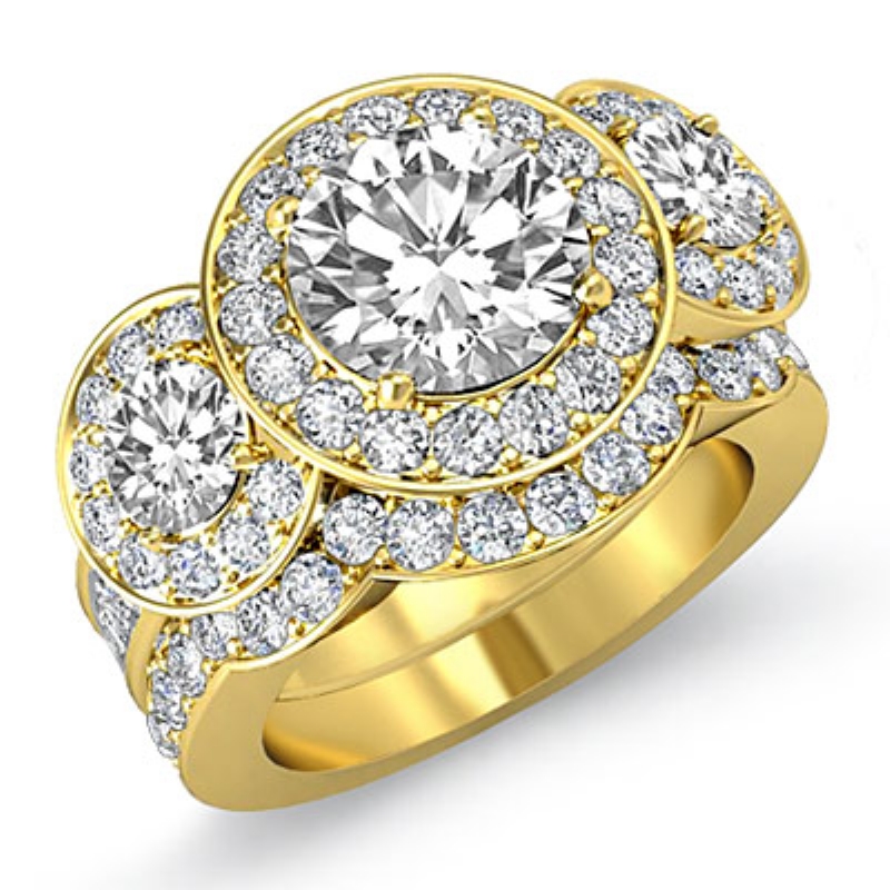 3 Stone Halo Bridal Set style Engagement Ring, center is Round shape Diamond Report by GIA, I Color & SI1 clarity, Made in 14k Yellow Gold (2.77 ct. tw.)