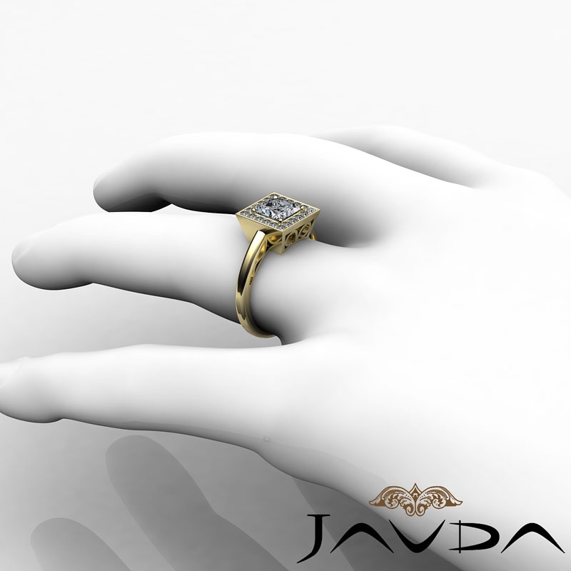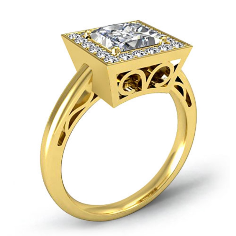 Halo Pave Filigree Design style Engagement Ring, center is Princess shape Diamond Report by GIA, J Color & VS1 clarity, Made in 18k Yellow Gold (1.29 ct. tw.)
