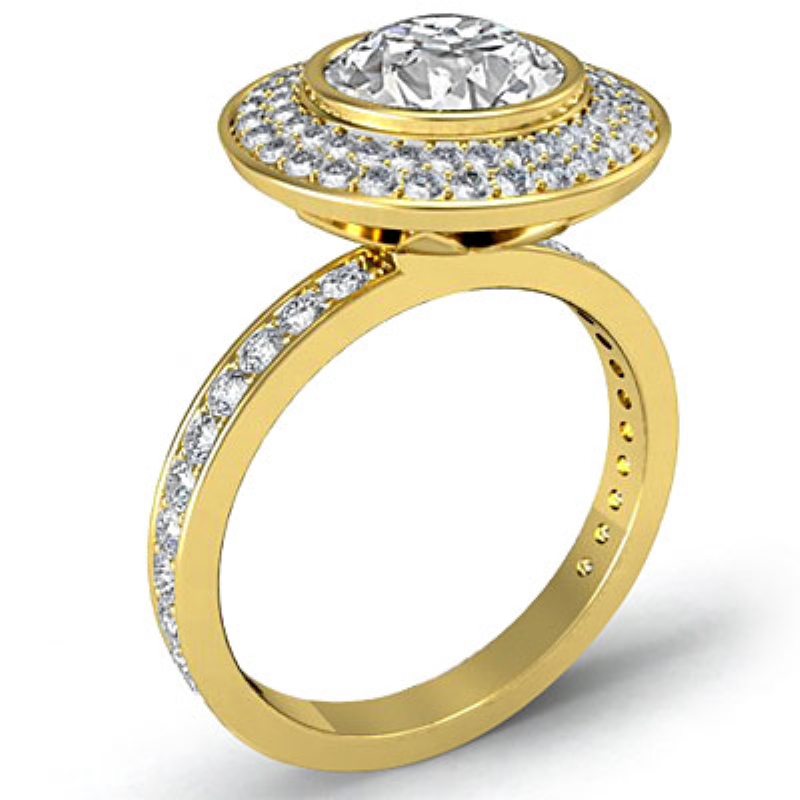 2 Row Halo Pave Bezel Set style Engagement Ring, center is Round shape Diamond Report by GIA, F Color & VVS1 clarity, Made in 18k Yellow Gold (1.25 ct. tw.)