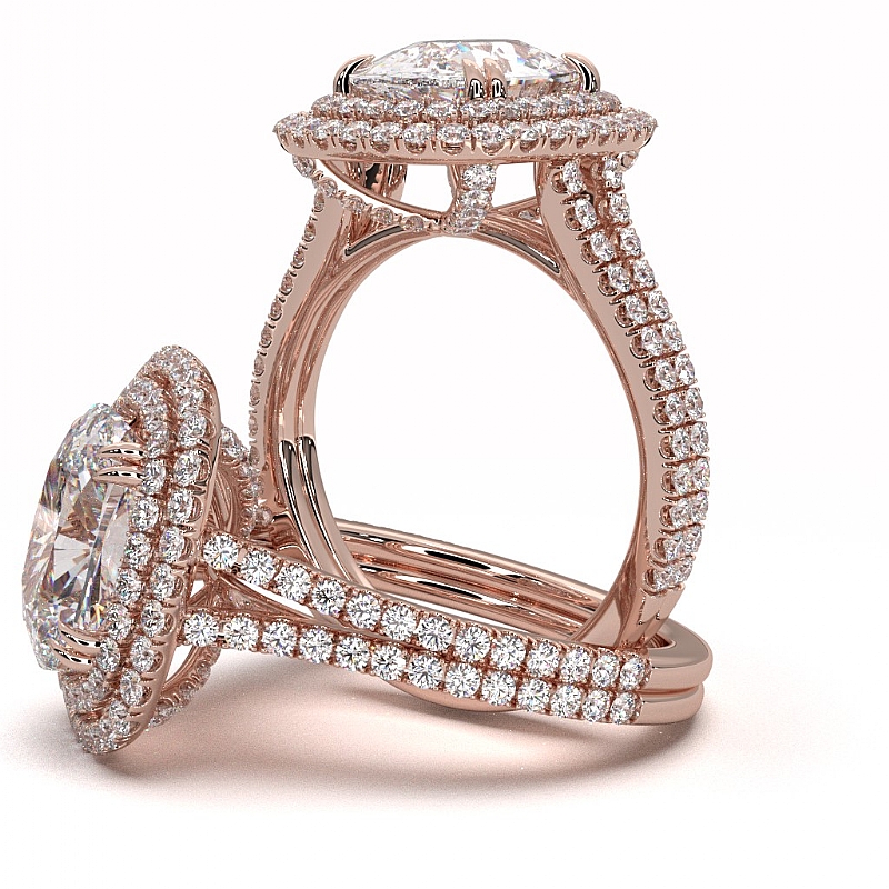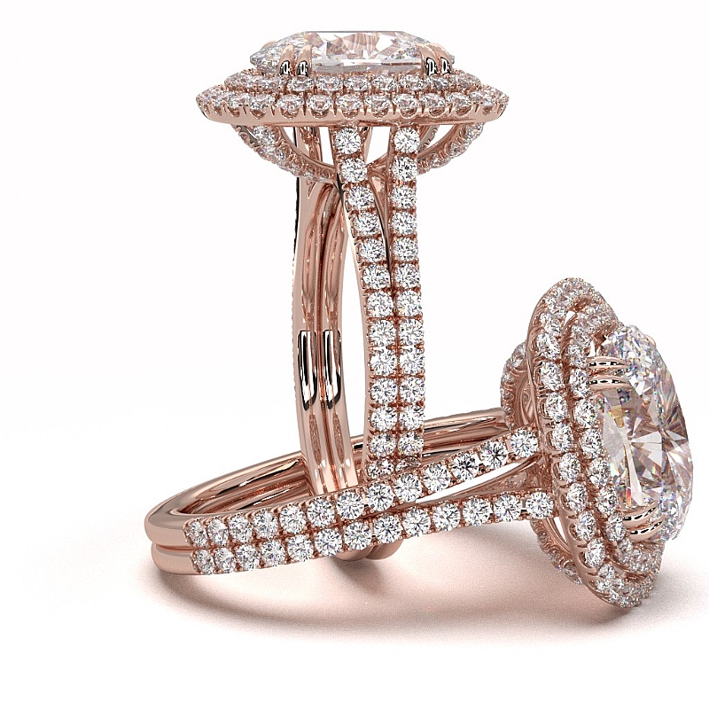 Gala Halo Pave Split Shank style Engagement Ring, center is Cushion shape Diamond Report by GIA, E Color & VVS2 clarity, Made in 14k Rose Gold (2.55 ct. tw.)
