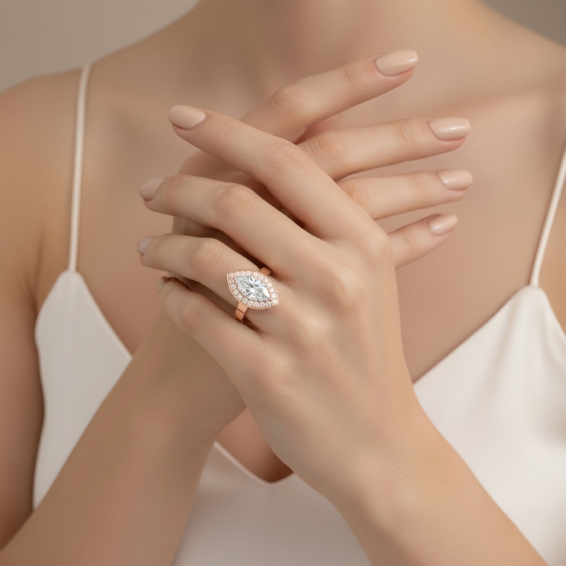 Marquise shape is diamond certified by GIA, 100% natural I color & SI1 clarity {0.95 ctw.}.