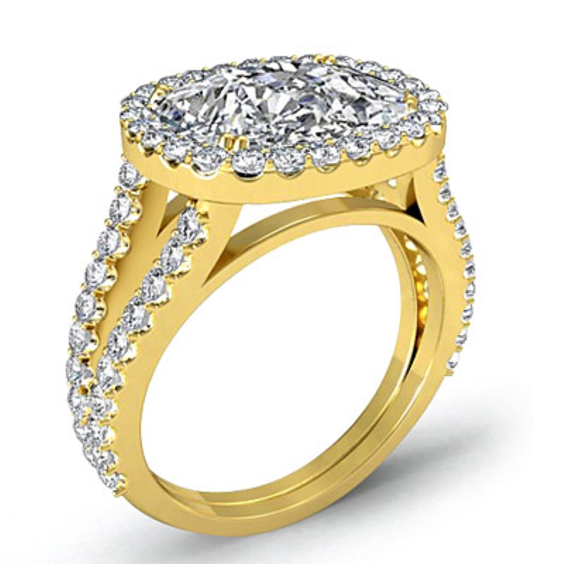 Big Halo Pave Split Shank style Engagement Ring, center is Cushion shape Diamond Report by GIA, F Color & VS1 clarity, Made in 18k Yellow Gold (6.98 ct. tw.)