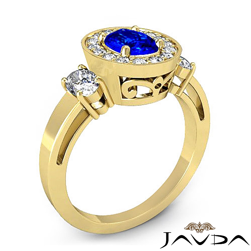 Filigree Halo Three Stone style Engagement Ring, center is Oval shape D Block Tanzanite Report by , Color & clarity, Made in 14k Yellow Gold (2.05 ct. tw.)