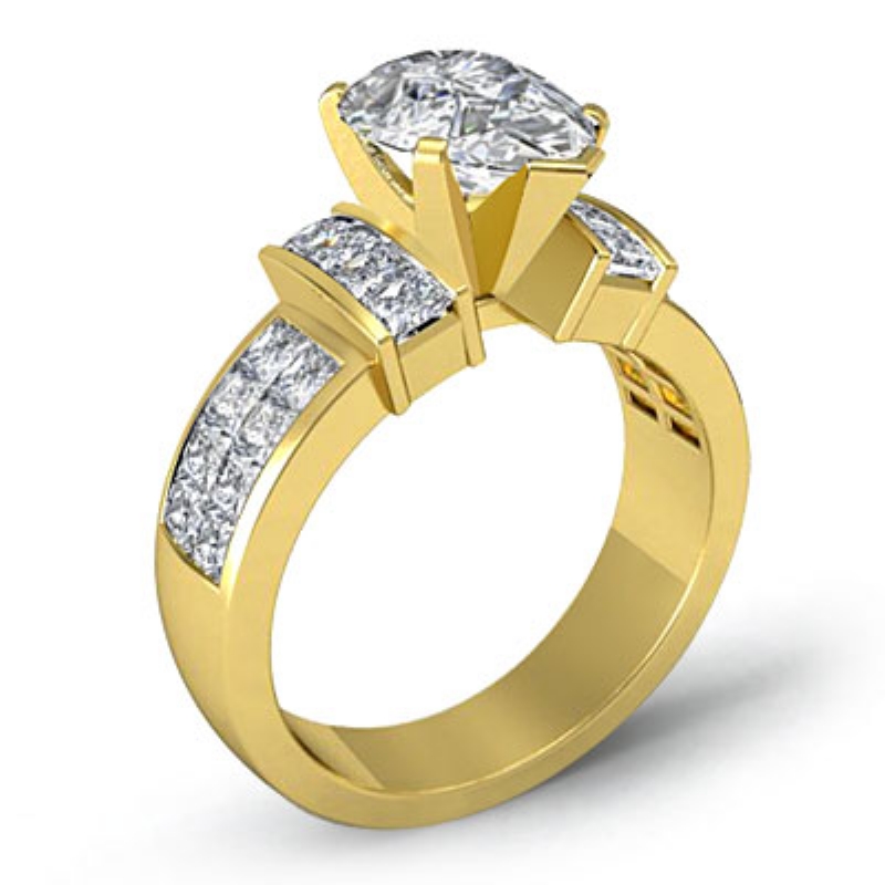 Classic Side-Stone Invisible style Engagement Ring, center is Pear shape Diamond Report by GIA, F Color & SI1 clarity, Made in 14k Yellow Gold (1.55 ct. tw.)