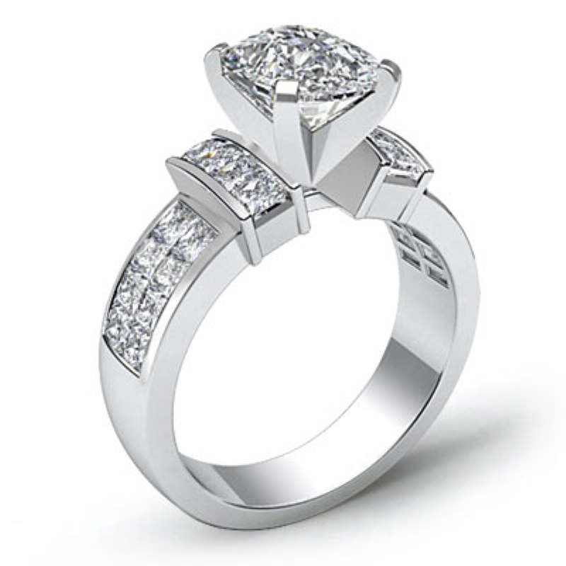 Classic Side-Stone Invisible style Engagement Ring, center is Cushion shape Diamond Report by GIA, H Color & VVS2 clarity, Made in Platinum 950 (1.54 ct. tw.)