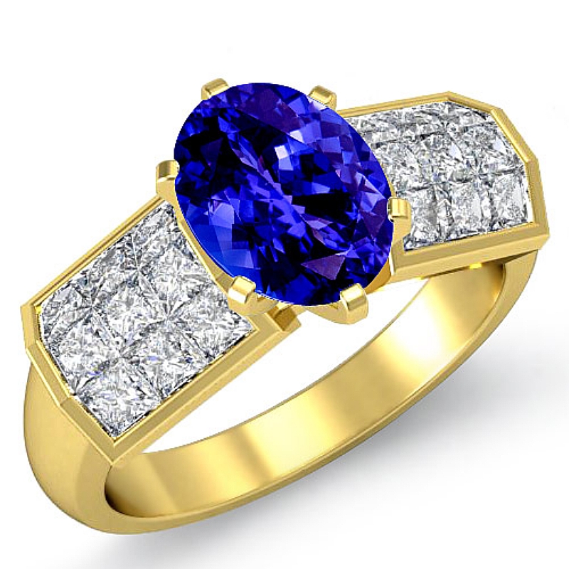 Invisible 4 Prong Setting style Engagement Ring, center is Oval shape D Block Tanzanite Report by , Color & clarity, Made in 14k Yellow Gold (2.06 ct. tw.)